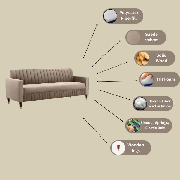 - Materials = Frame – solid wood / Seating = 40-density foam / Tufted back = Soft foam & Recron fiber / Upholstery Material = Premium Velvet Suede Fabric / Legs = Heavy-quality wooden / Seating Capacity = 3 seater / Comfort Level = Medium Firm. Zigzag Spring Suspension System = Heavy gauge zigzag springs are used under the foam to provide extra strength, comfort, and bounce.